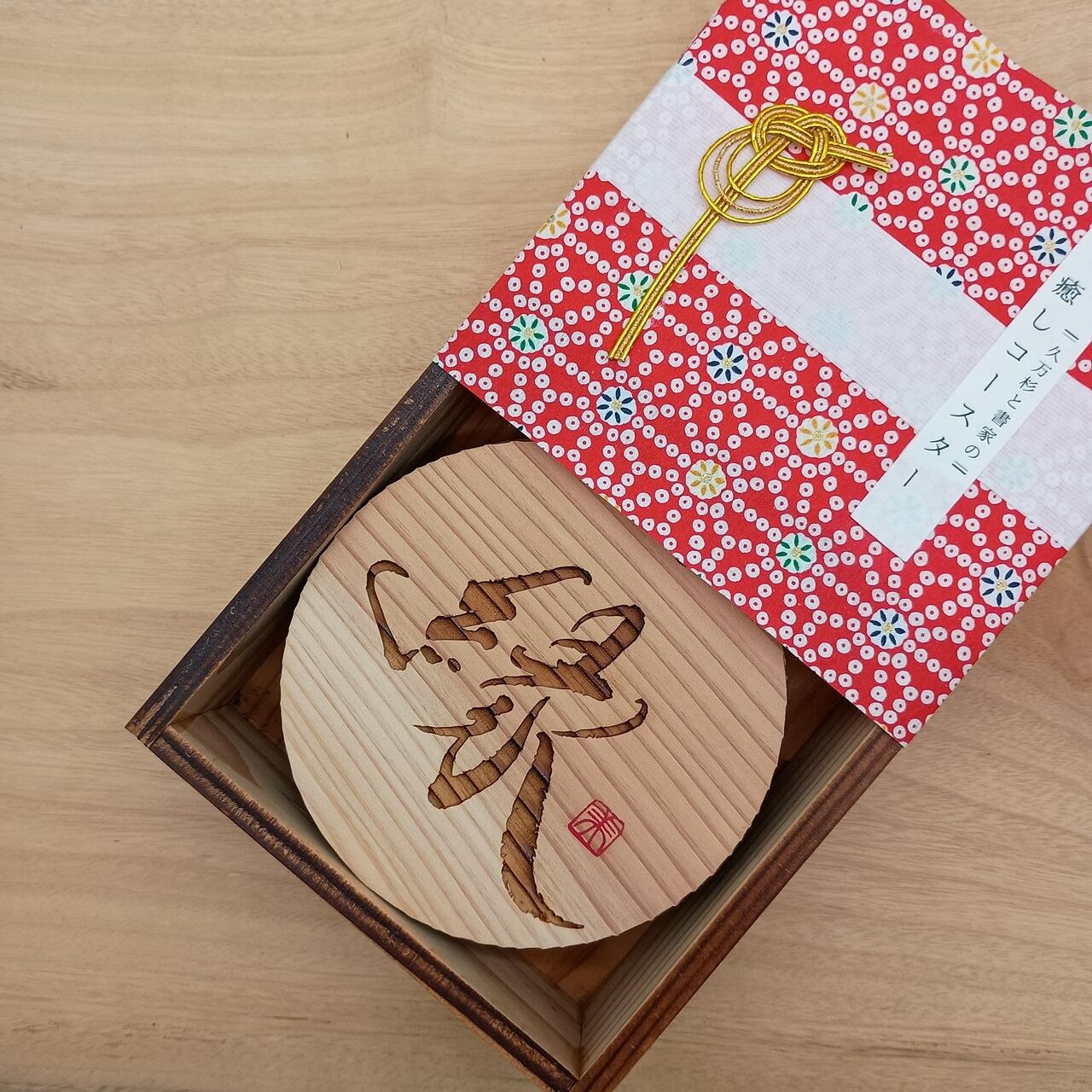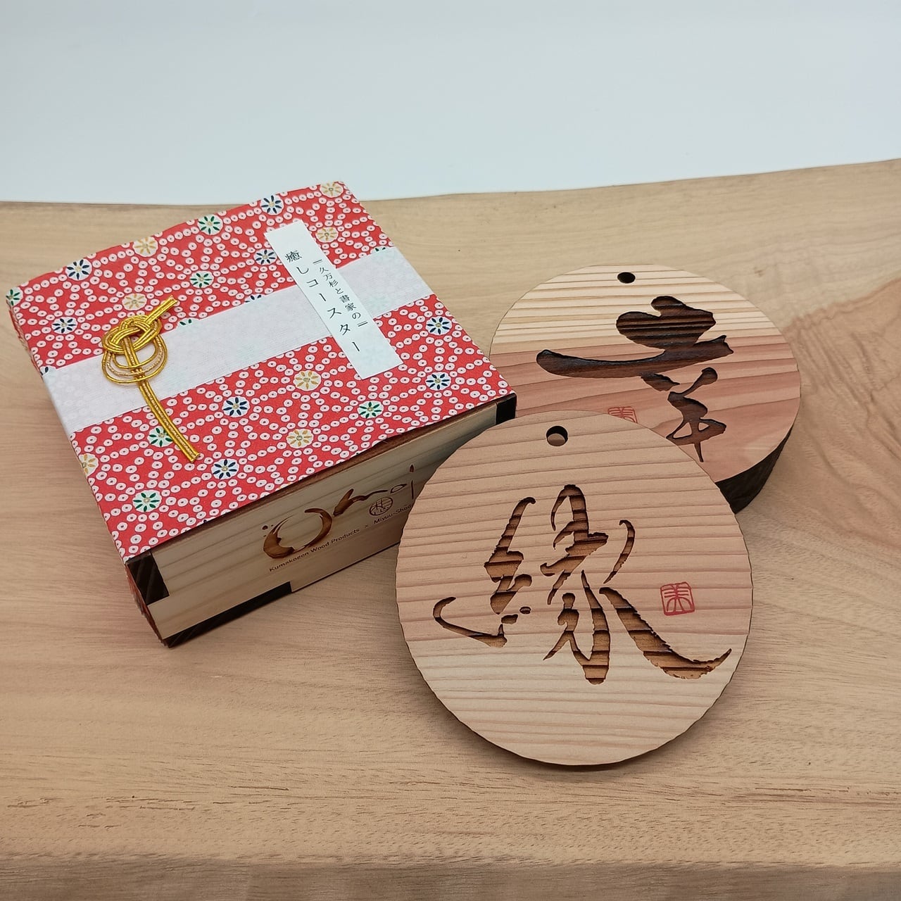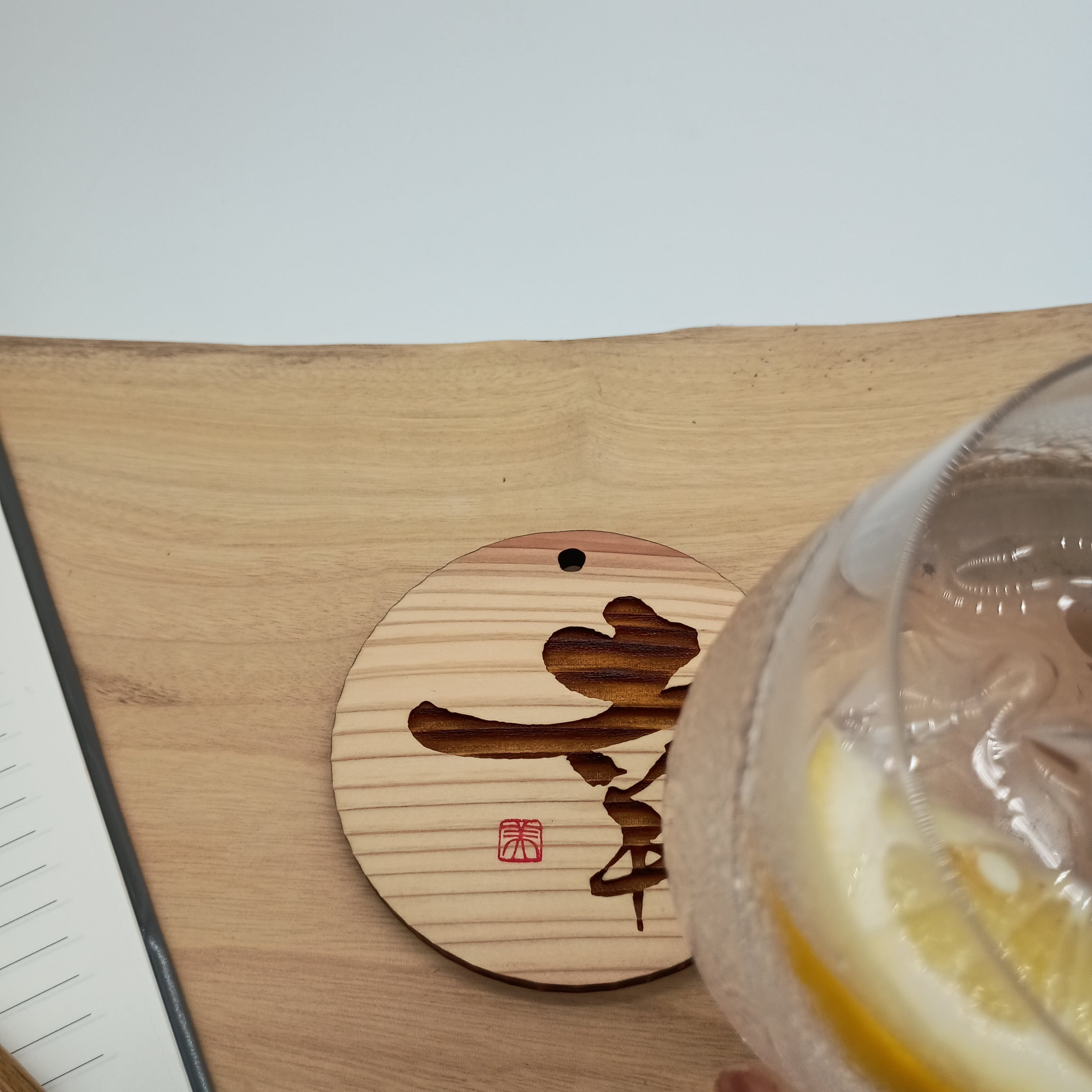 本製品は、自然豊かな町・愛媛県久万高原町の天然スギに、デザイン書道家美結のオリジナル文字を刻んだ、世界にひとつだけの木製コースターです。