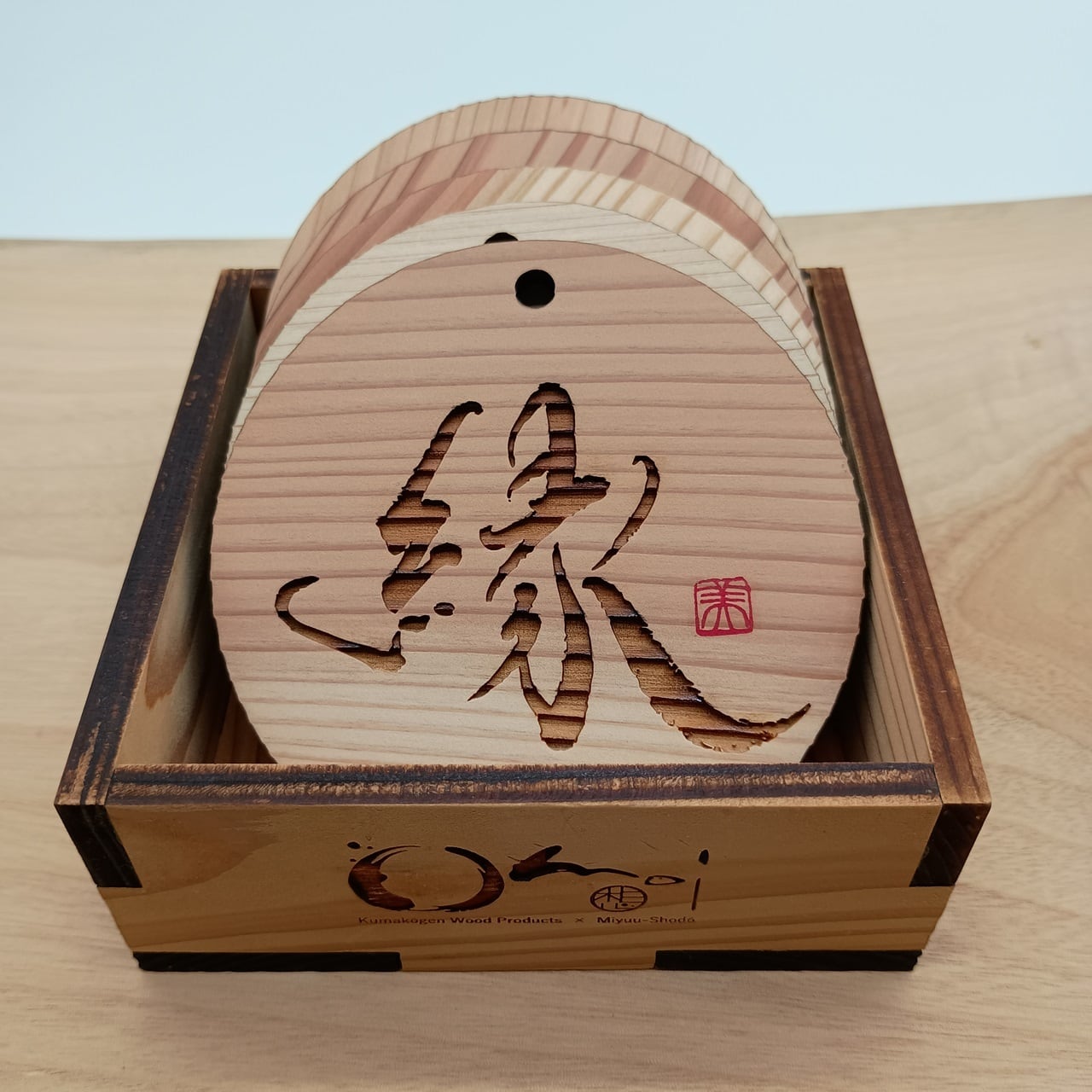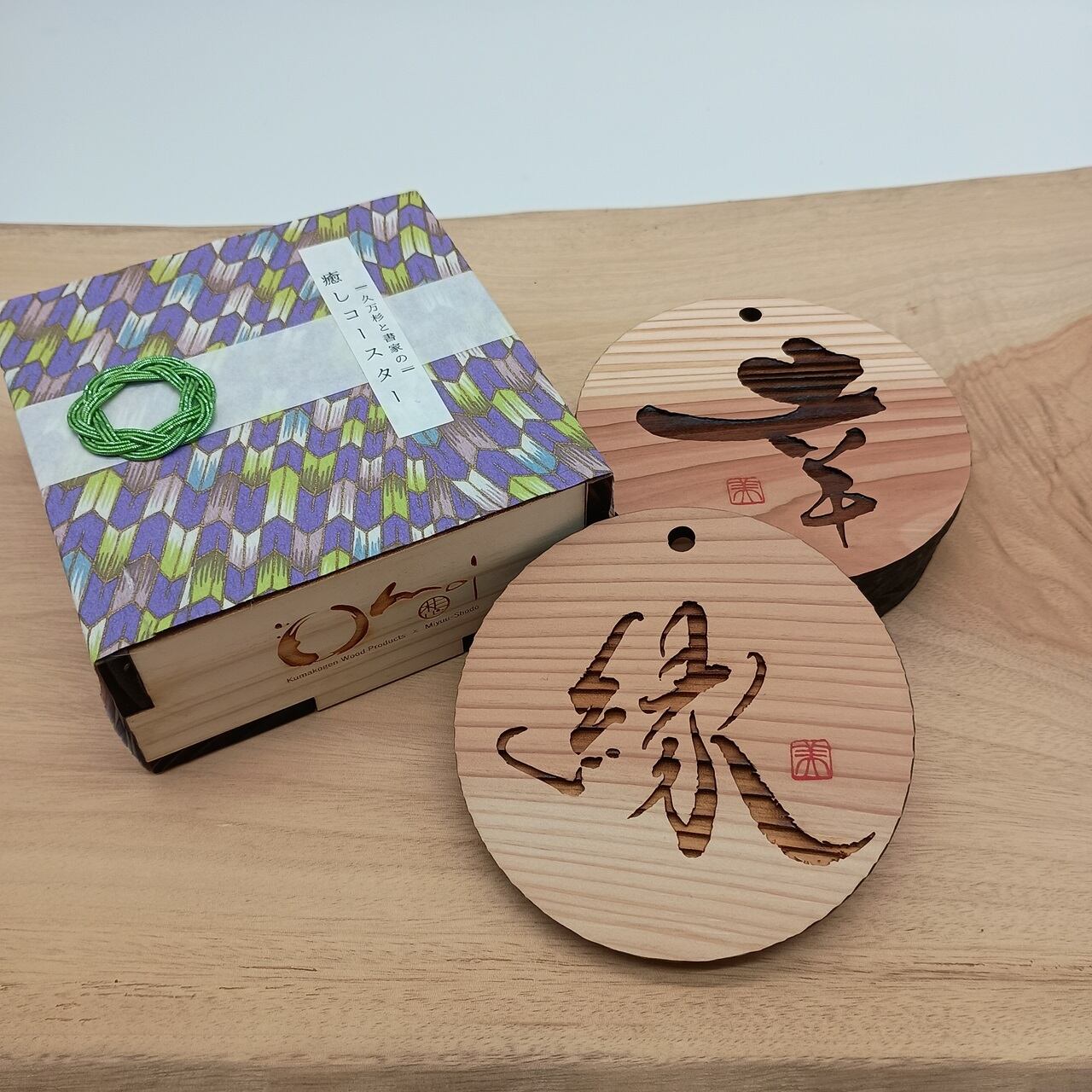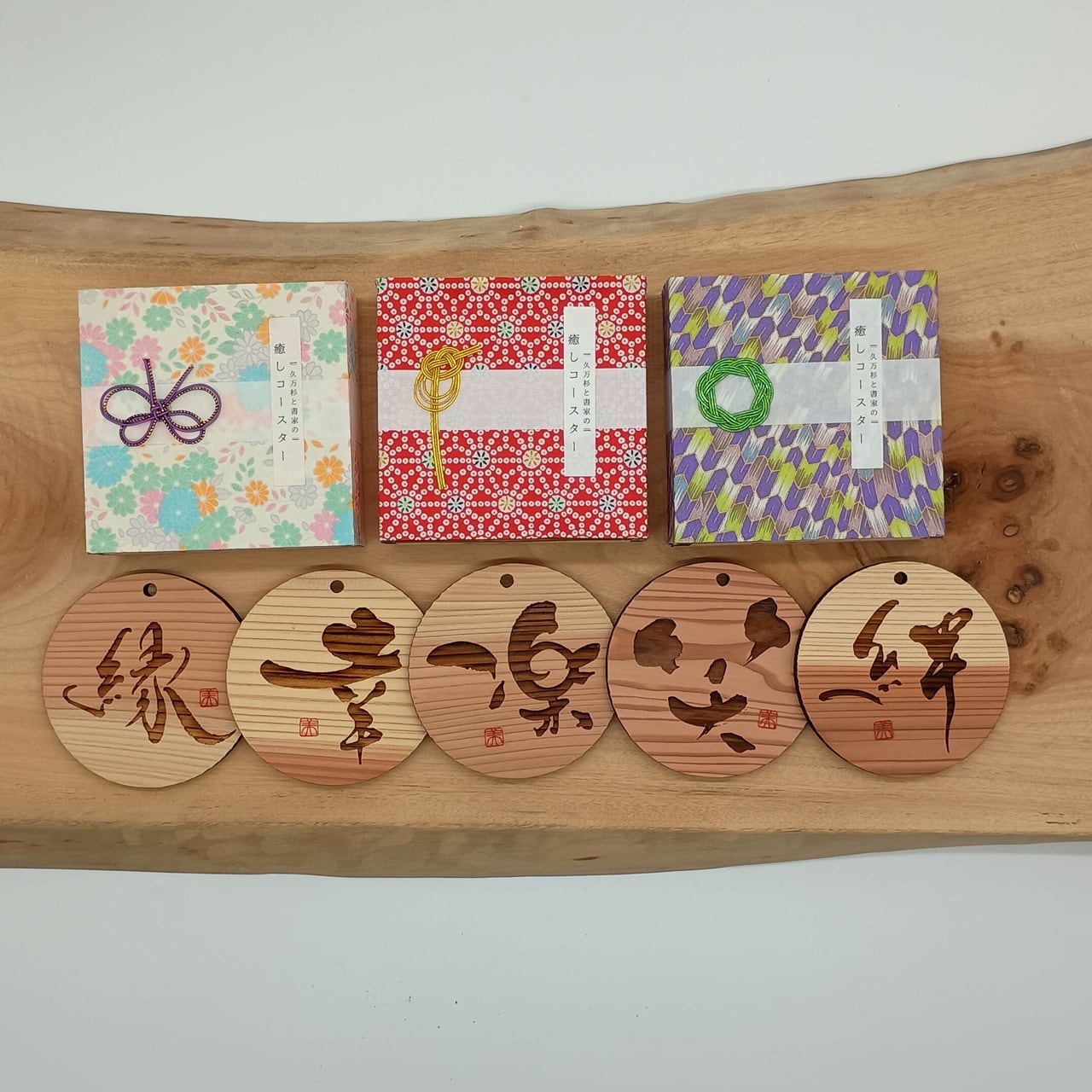 本製品は、自然豊かな町・愛媛県久万高原町の天然スギに、デザイン書道家美結のオリジナル文字を刻んだ、世界にひとつだけの木製コースターです。